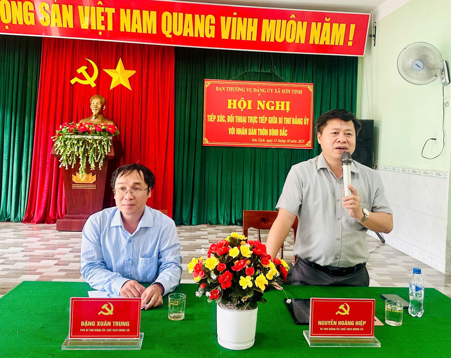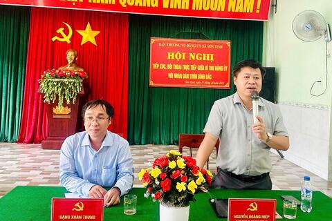 Đồng chí Nguyễn Hoàng Hiệp - Bí thư Đảng ủy, Chủ tịch HĐND xã Sơn Tịnh và đồng chí Đặng Xuân Trung - Phó Bí thư Đảng ủy, Chủ tịch UBND xã Sơn Tịnh, chủ trì Hội nghị tiếp xúc, đối thoại.