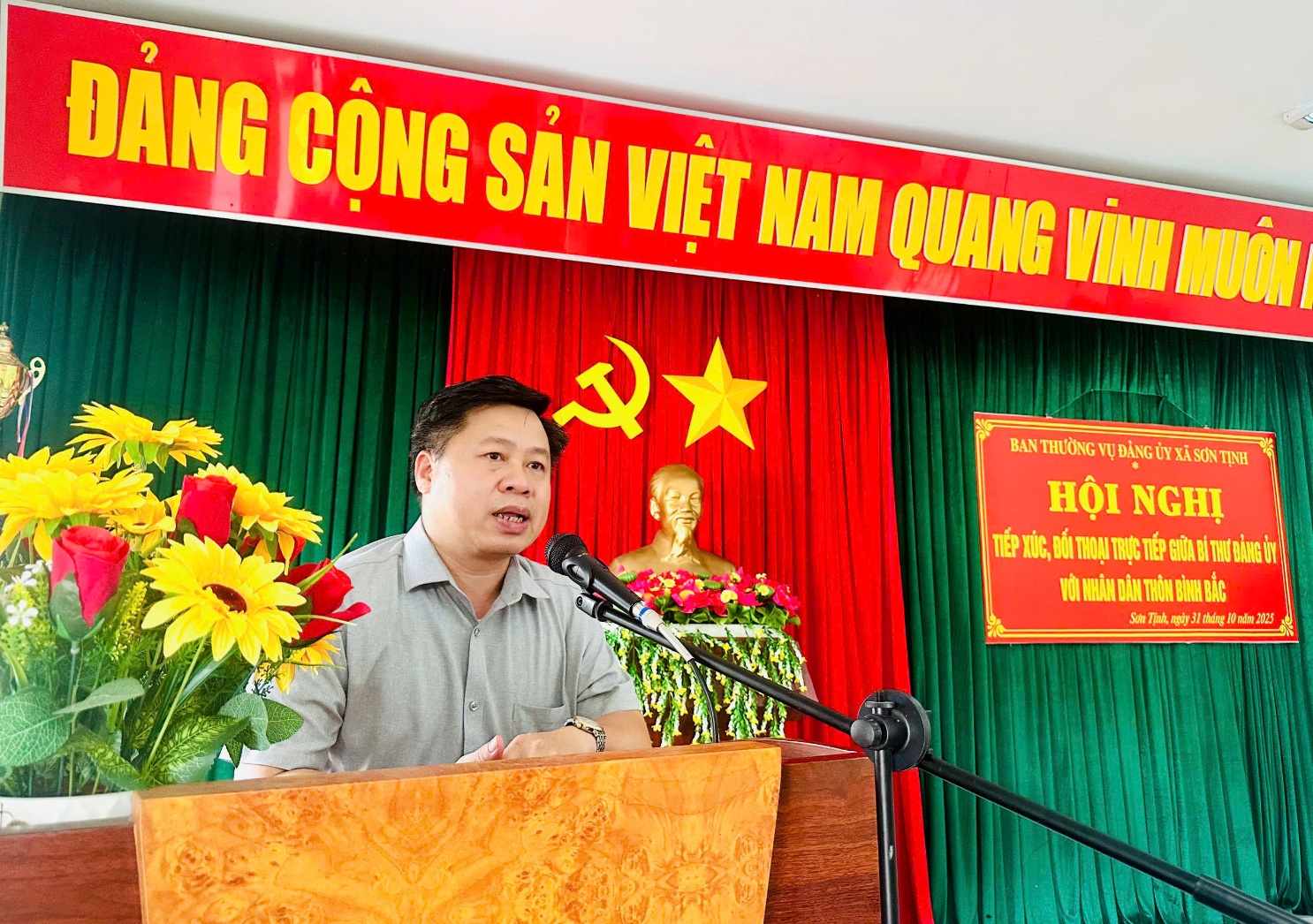 Thực hiện Kế hoạch số 12-KH/ĐU ngày 09/10/2025 của Ban Thường vụ Đảng ủy xã về việc tổ chức hội nghị tiếp xúc, đối thoại trực tiếp giữa người đứng đầu cấp ủy, chính quyền với Nhân dân, sáng ngày 31/10/2025, tại Nhà Văn hóa thôn Bình Bắc, Đảng ủy, HĐND, UBND xã Sơn Tịnh đã tổ chức Hội nghị tiếp xúc, đối thoại trực tiếp giữa lãnh đạo xã với Nhân dân thôn Bình Bắc.