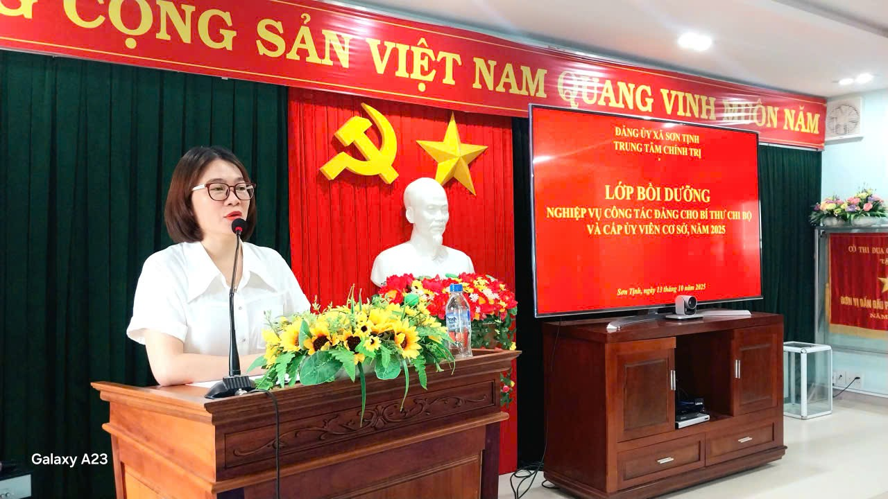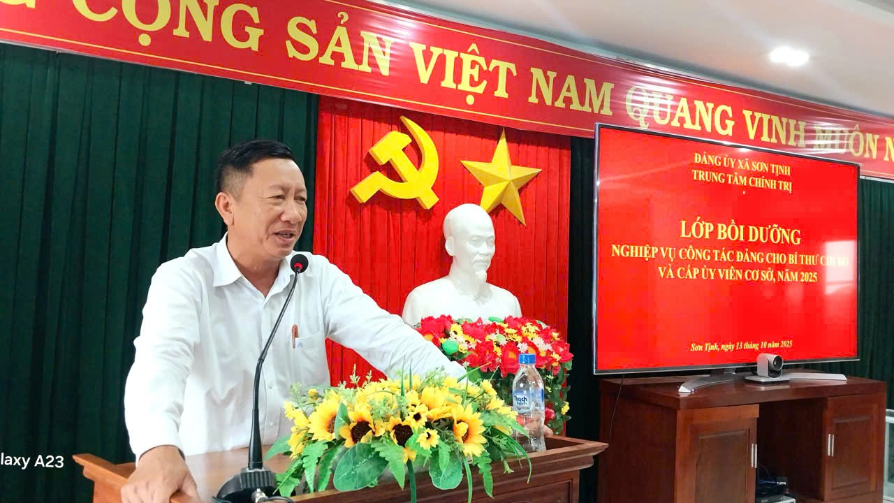 Chiều ngày 13/10/2025, Trung tâm Chính trị xã Sơn Tịnh tổ chức Khai giảng lớp Bồi dưỡng nghiệp vụ công tác Đảng cho Bí thư Chi bộ và cấp ủy viên cơ sở năm 2025. Đến dự Lễ khai giảng có đồng chí Huỳnh Văn Tịnh - Phó Bí thư Thường trực Đảng ủy xã; đồng chí Nguyễn Hồng Nhân - UVBTV, Trưởng Ban xây dựng Đảng Đảng uỷ xã; đồng chí Nguyễn Thị Minh Việt - ĐUV, Giám đốc Trung tâm Chính trị xã và các học viên là các đồng chí Bí thư Chi bộ và cấp ủy viên cơ sở.