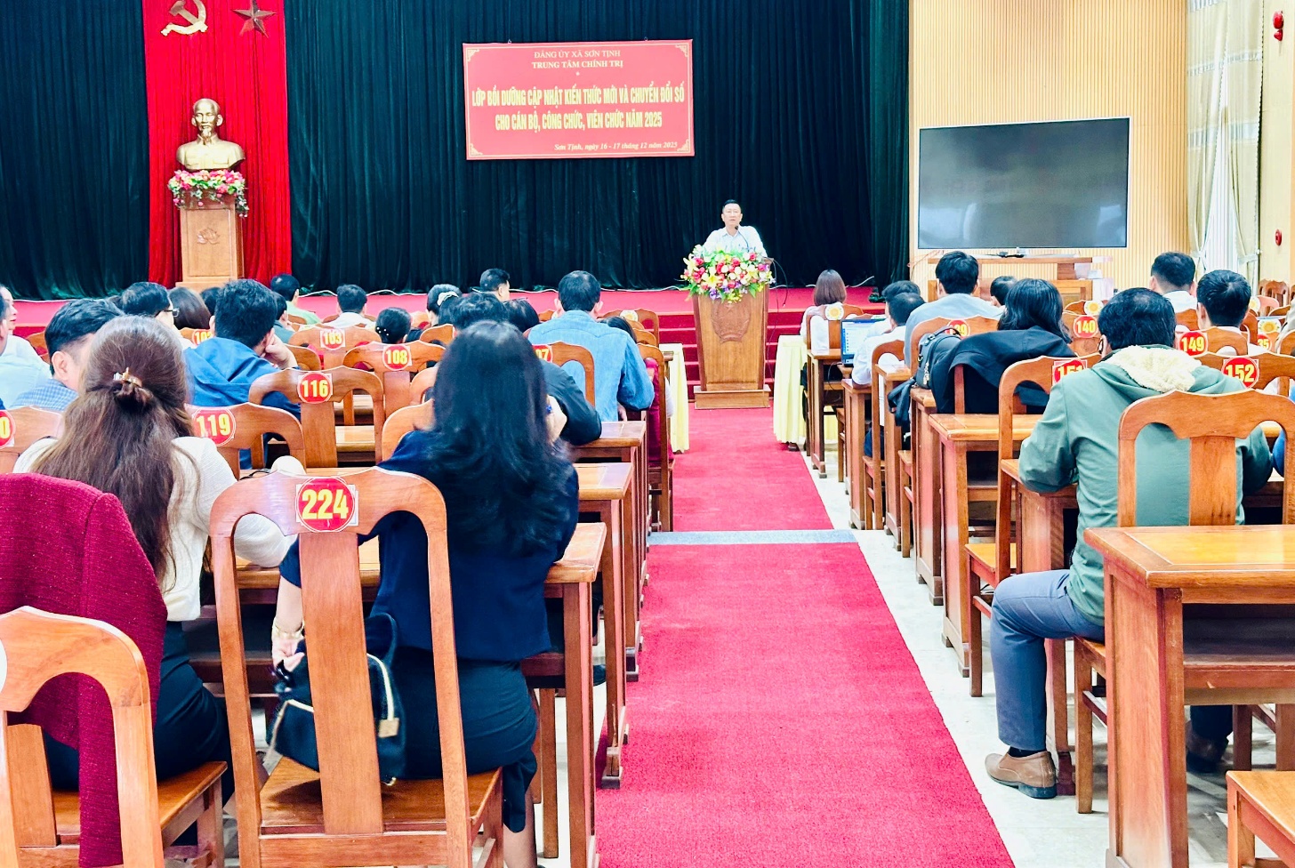 Sáng ngày 16/12/2025, Trung tâm Chính trị xã Sơn Tịnh đã tổ chức khai giảng Lớp bồi dưỡng cập nhật kiến thức mới và chuyển đổi số cho cán bộ, công chức, viên chức năm 2025. Đây là hoạt động có ý nghĩa thiết thực nhằm nâng cao nhận thức, năng lực chuyên môn và kỹ năng ứng dụng công nghệ số cho đội ngũ cán bộ, công chức, viên chức, đáp ứng yêu cầu nhiệm vụ trong tình hình mới.
