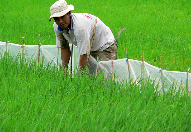 Dùng nilon làm hàng rào bảo vệ lúa khỏi chuột phá hại