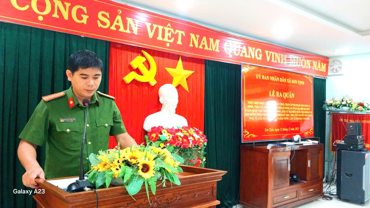 Sáng ngày 12/12/2025, UBND xã Sơn Tịnh tổ chức Lễ ra quân thực hiện đợt cao điểm tấn công, trấn áp tội phạm, bảo đảm an ninh, trật tự, bảo vệ tuyệt đối an ninh, an toàn Đại hội đại biểu toàn quốc lần thứ XIV của Đảng, bầu cử đại biểu Quốc hội khóa XVI, Hội đồng nhân dân các cấp nhiệm kỳ 2026 - 2031, Tết nguyên đán Bính Ngọ và các sự kiện lớn của đất nước, các lễ hội đầu năm 2026.