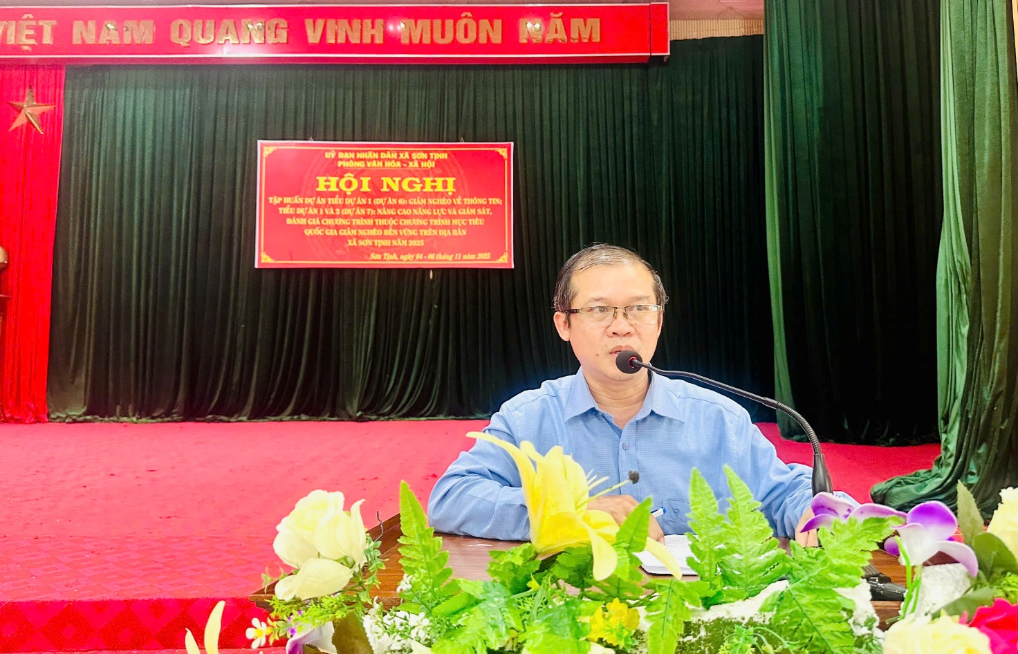 Phát biểu tại Hội nghị tập huấn, đồng chí Võ Tấn Trung - Trưởng Phòng Văn hóa - Xã hội xã Sơn Tịnh, nhấn mạnh: “Công tác giảm nghèo bền vững là nhiệm vụ trọng tâm, thường xuyên của hệ thống chính trị từ xã đến thôn. Việc tổ chức Hội nghị tập huấn hôm nay nhằm trang bị thêm kiến thức, kỹ năng thực hành và phương pháp làm việc cho đội ngũ cán bộ trực tiếp thực hiện công tác giảm nghèo, giúp họ chủ động, linh hoạt hơn trong việc triển khai các chính sách hỗ trợ, đồng thời nâng cao năng lực giám sát, đánh giá để đảm bảo các nguồn lực được sử dụng đúng mục tiêu, đúng đối tượng.”