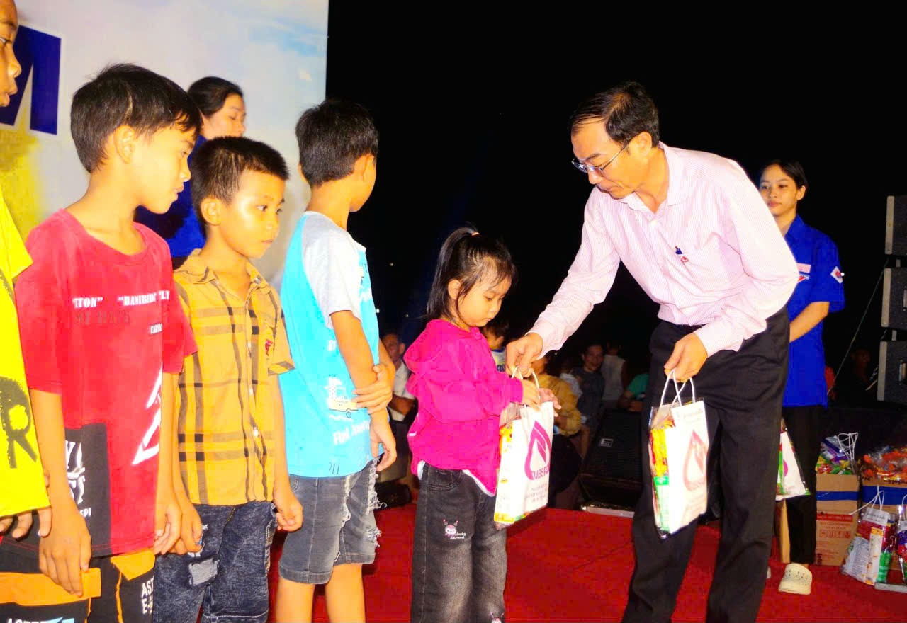 Ông Nguyễn Công Chúng – Giám đốc Ngân hàng Chính sách xã hội Sơn Tịnh tặng quà cho các em thiếu nhi có hoàn cảnh khó khăn