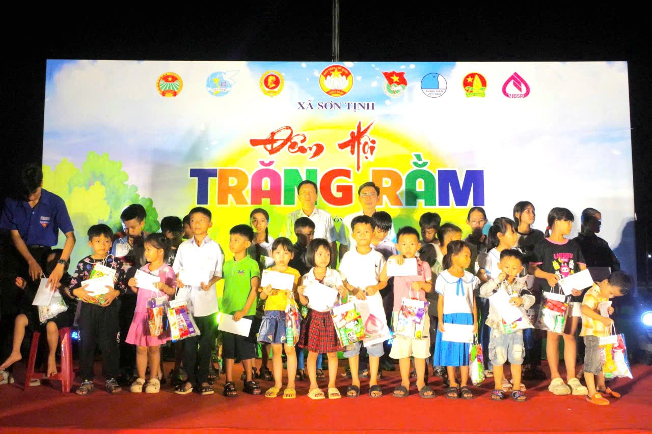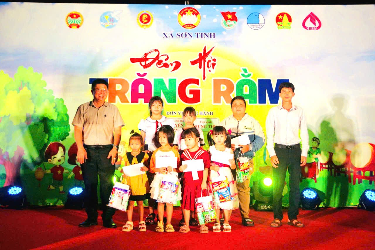 Dịp này, Ban tổ chức chương trình “Đêm hội trăng rằm” xã Sơn Tịnh đã trao tặng 80 suất quà (mỗi suất trị giá 300.000đ) cho các em thiếu nhi hộ nghèo, cận nghèo, hoàn cảnh khó khăn và khuyết tật và 250 suất bánh kẹo cho các thiếu nhi có hoàn cảnh khó khăn trên địa bàn xã Sơn Tịnh.