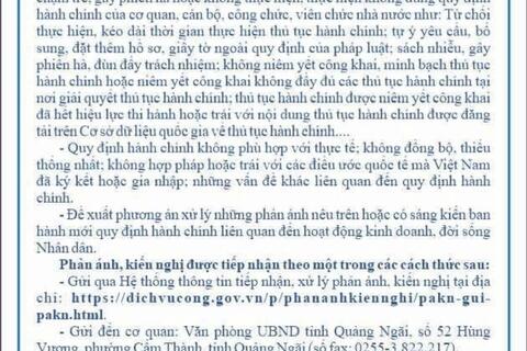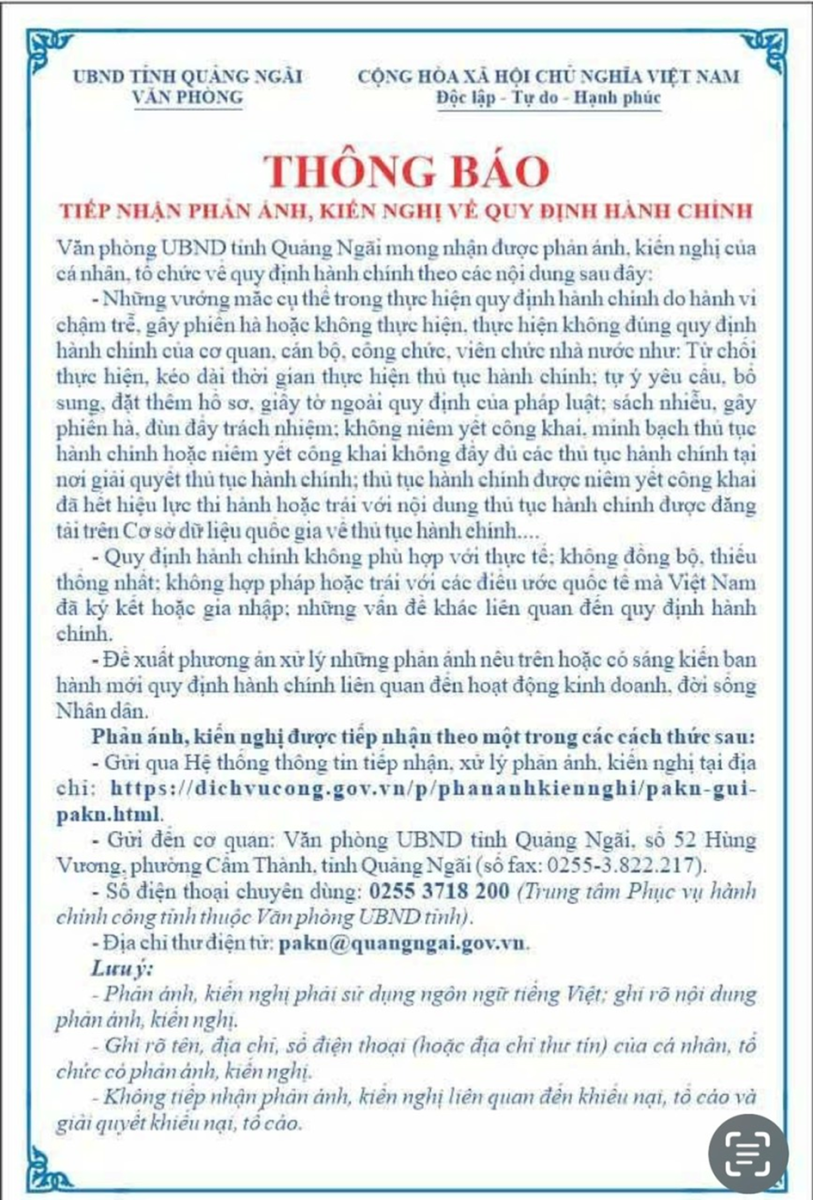 THÔNG BÁO TIẾP NHẬN PHẢN ÁNH, KIẾN NGHỊ VỀ QUY ĐỊNH HÀNH CHÍNH