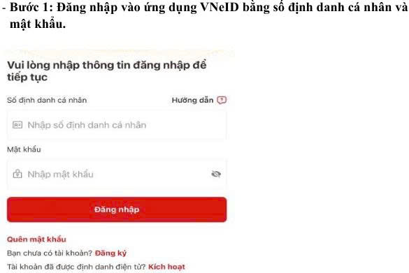 Bước 1: Cài đặt ứng dụng và đăng nhập vào ứng dụng VNeID bằng số định danh cá nhân và mật khẩu.
