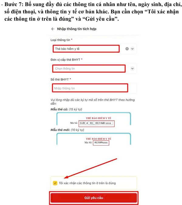 Bước 7: Bổ sung đầy đủ các thông tin cá nhân như tên, ngày sinh, địa chỉ, số điện thoại, và thông tin y tế cơ bản khác. Bạn cần chọn “Tôi xác nhận các thông tin ở trên là đúng” và “Gửi yêu cầu”.