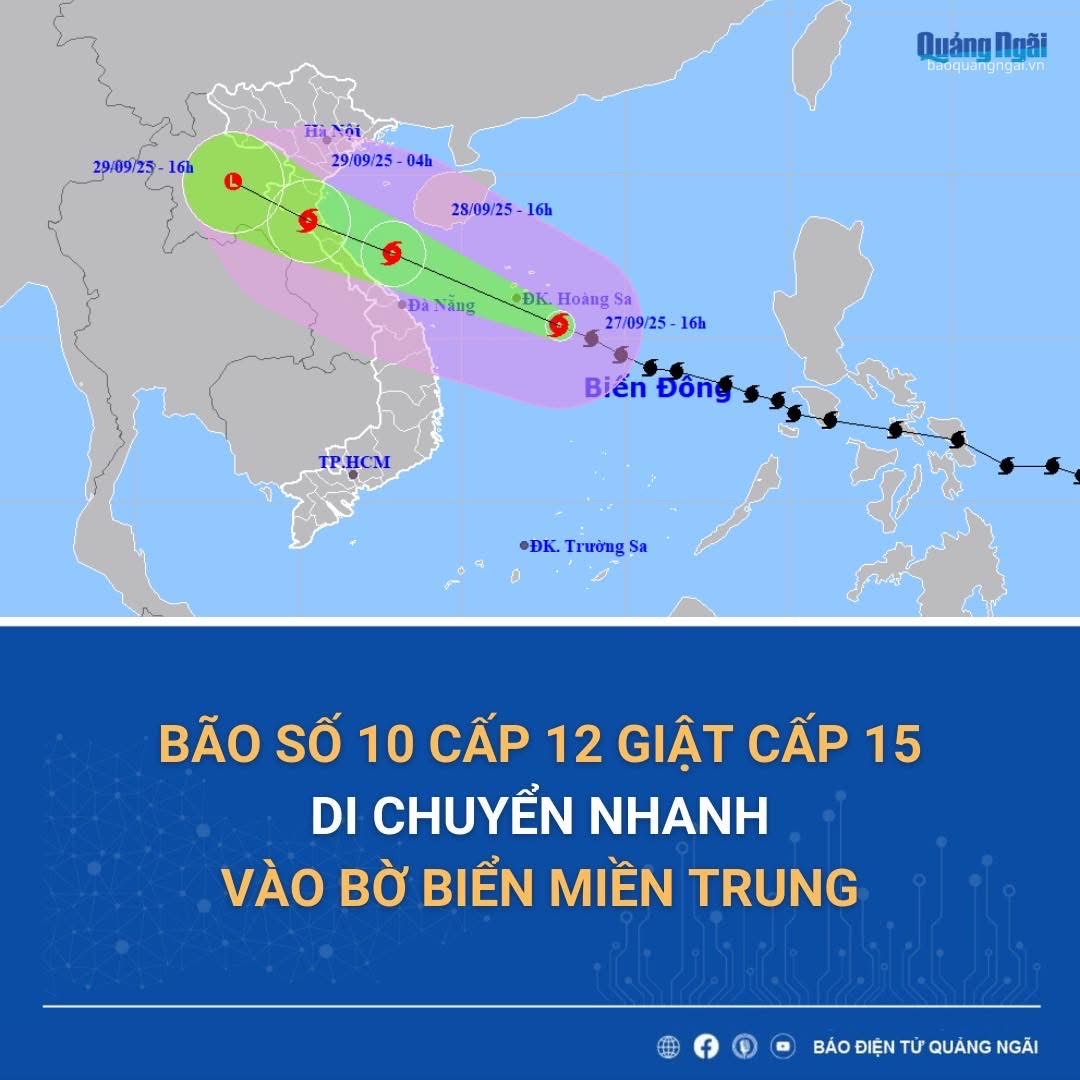 Theo thông tin từ Đài Khí tượng Thuỷ văn Quảng Ngãi, bão số 10 (tên quốc tế Bualoi) đang tiến nhanh vào bờ biển miền Trung. Đây là cơn bão di chuyển rất nhanh, cường độ mạnh và có khả năng gây ra tác động tổng hợp của nhiều loại hình thiên tai: gió giật mạnh, mưa lớn trên diện rộng, lũ, lũ quét, sạt lở đất ở vùng núi và ngập lụt ven biển.