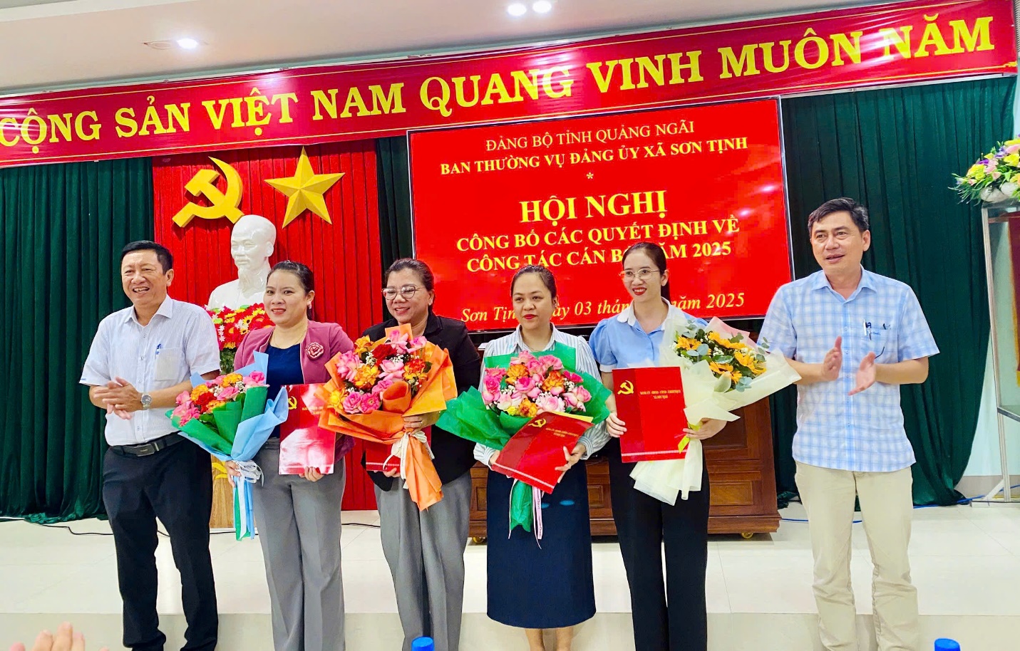 Đảng ủy xã Sơn Tịnh đã long trọng tổ chức Hội nghị công bố các quyết định về công tác cán bộ năm 2025. Đây là hoạt động có ý nghĩa quan trọng, thể hiện sự quan tâm, chỉ đạo kịp thời của Đảng ủy xã trong việc kiện toàn tổ chức bộ máy, sắp xếp, bố trí đội ngũ cán bộ, công chức, viên chức phù hợp với yêu cầu nhiệm vụ trong tình hình mới, góp phần nâng cao chất lượng công tác xây dựng Đảng và hiệu quả hoạt động của hệ thống chính trị ở cơ sở.